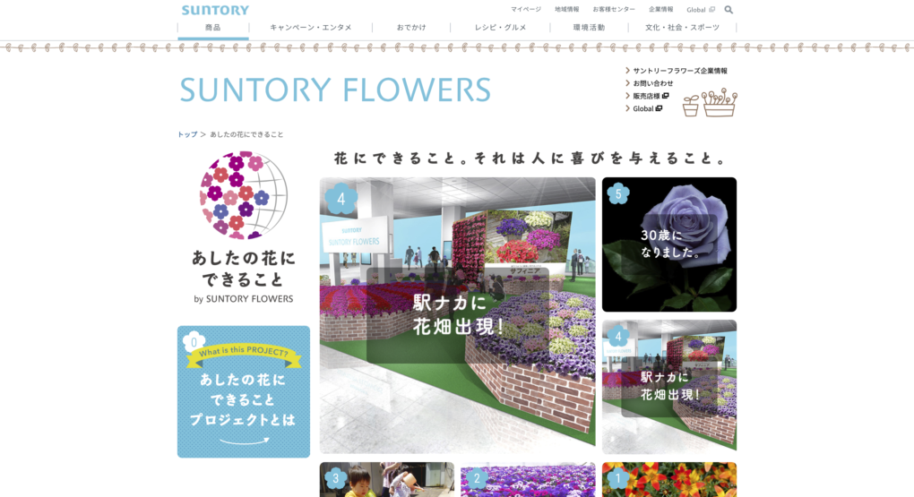 サントリーフラワーズ様の周年事業で、キャッチフレーズとロゴマークの制作をお手伝いさせていただきました。