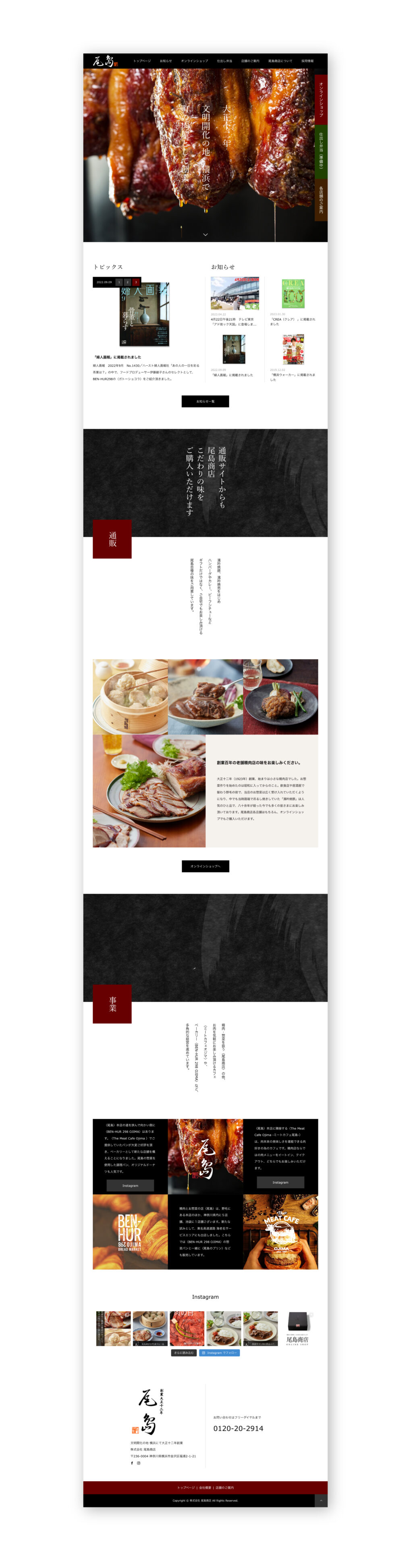 尾島商店のブランドを意識し、サイト構成からコピー・デザインまで一貫して制作しました。尾島商店を代表する人気商品「濱吟焼豚」に着目し、下味付けから製法、提供する直前のスライスするシーンを取材し撮影しました。