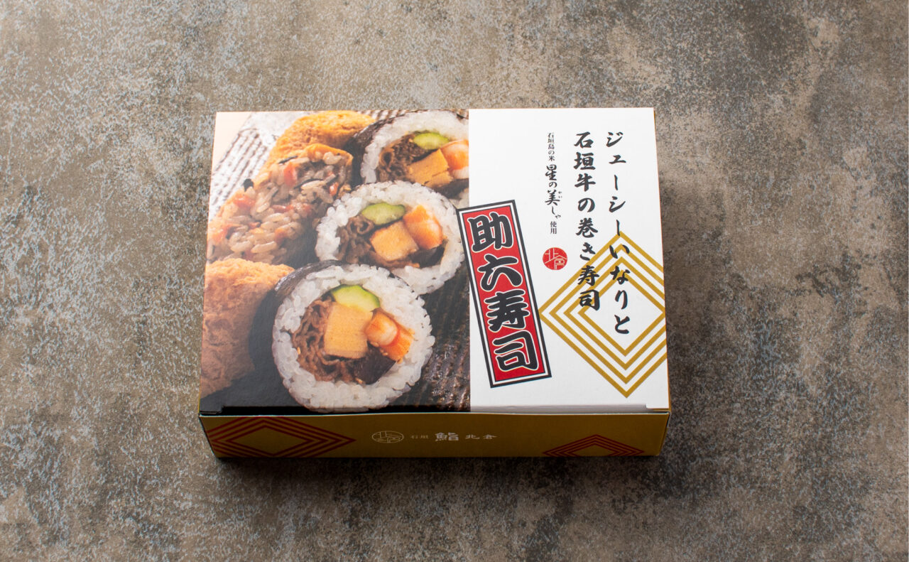 そんな助六寿司を〈鮨北倉〉は石垣島の味にアレンジ。いなり寿司は沖縄で愛されるジューシーを、巻き寿司には地元の名産である石垣牛を贅沢に使用。地元ならではの味を生かした特別な空弁に仕上がっています。
