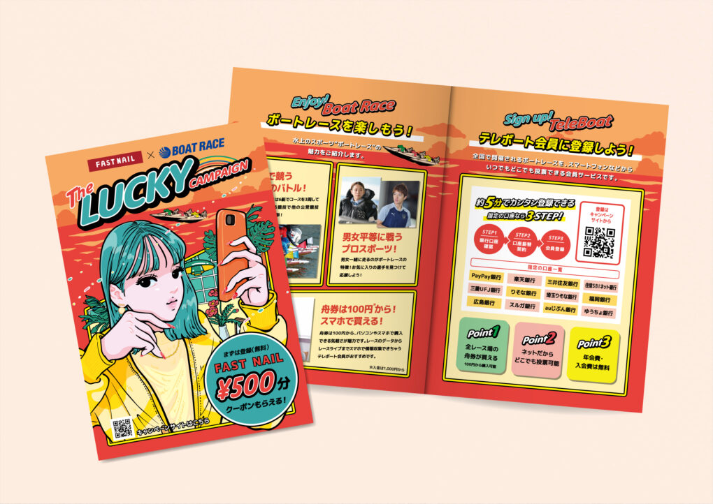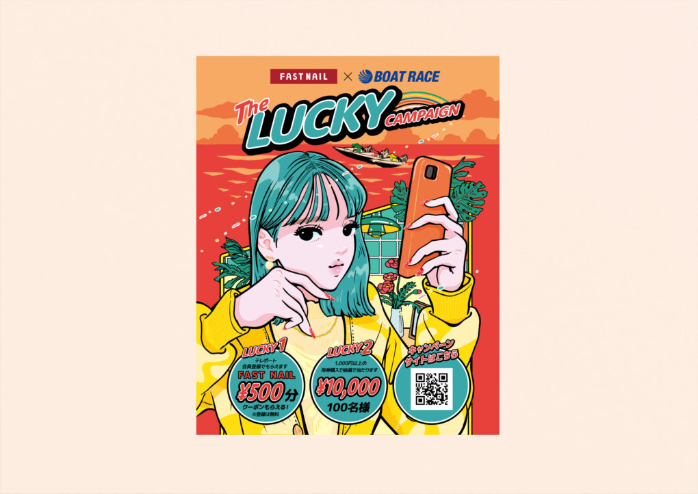 ボートレースとネイルサロンFASTNAILとのコラボレーション・キャンペーンビジュアルとプロモーションツールの制作をご依頼頂きました。イラストはアソビシステム所属「ABEchan」さん。広告代理店案件です。